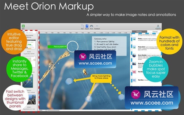 Orion Markup 是一款Mac上易用的图片标注注释工具,可以快速的为图片和PDF文档添加各种标注信息,文本、箭头、线条等。