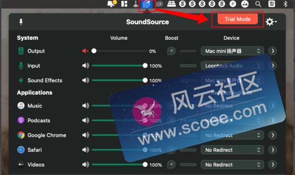 - 运行 SoundSource 程序,点击菜单栏「SoundSource 图标」,然后点击程序右上角的「Trial Mode」