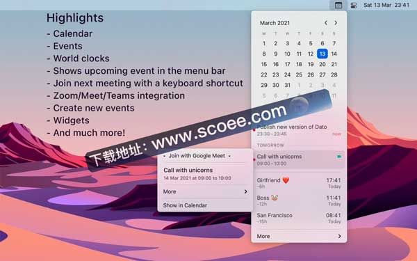 Dato在菜单栏中为您提供本地时钟,日期,多个世界时钟和即将发生的事件。当您单击菜单栏中的 Dato 时,您将获得一个包含日历、日历事件和世界时钟的菜单。这一切都很容易设置。